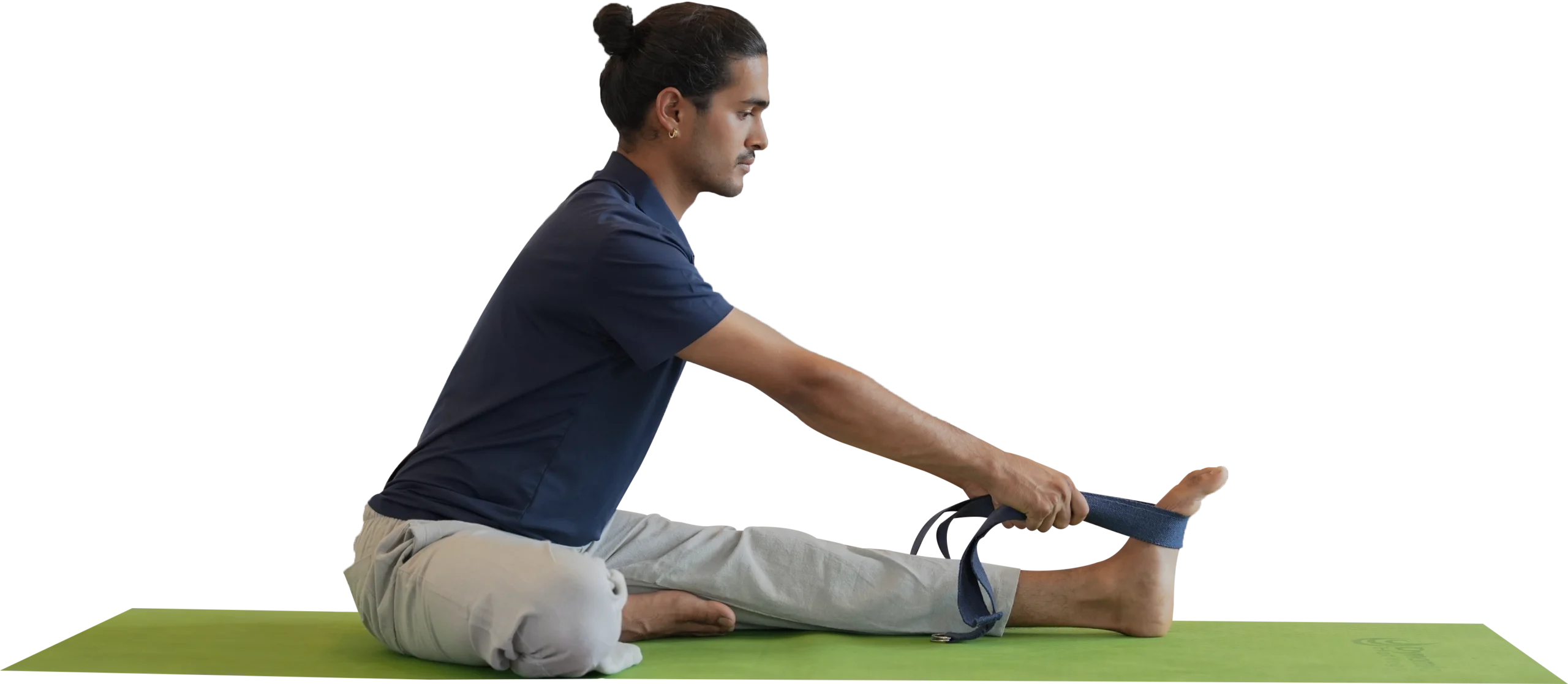 - Use the strap around the foot, slightly lift the head up keeping the spine straight, open the chest and stretch farther.