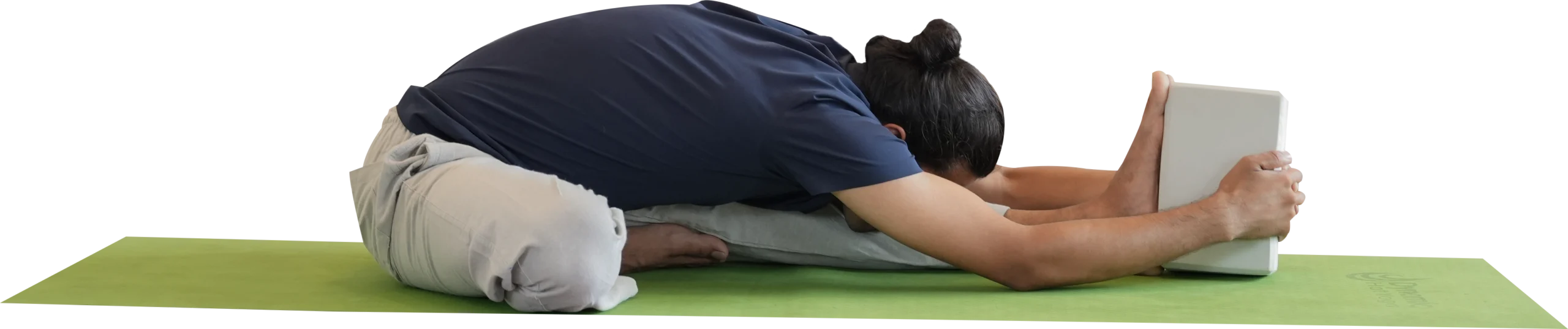 - Calms the nervous system through the gentle compression and forward bend, shifting the body into the parasympathetic state, which enhances deep and rhythmic breathing.