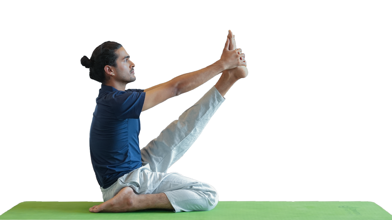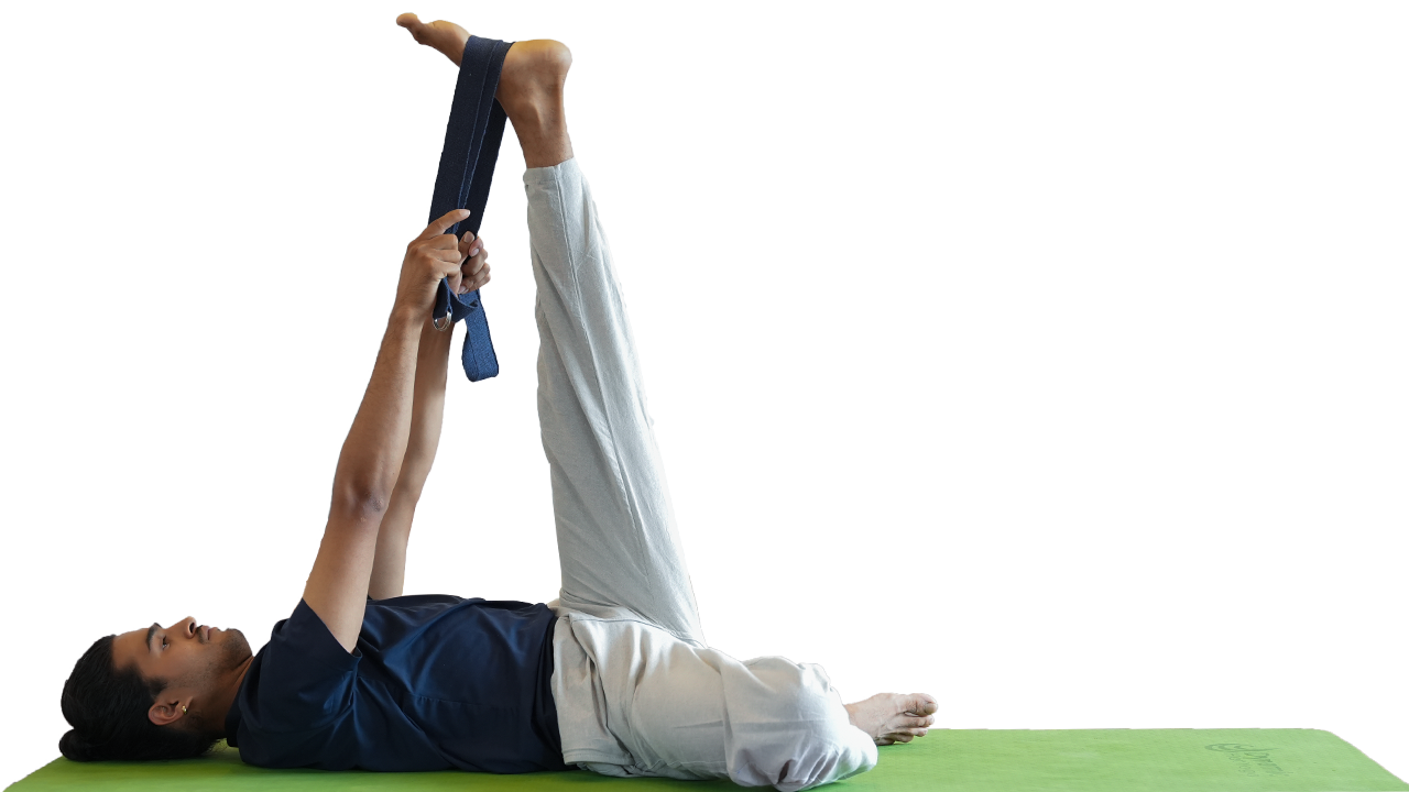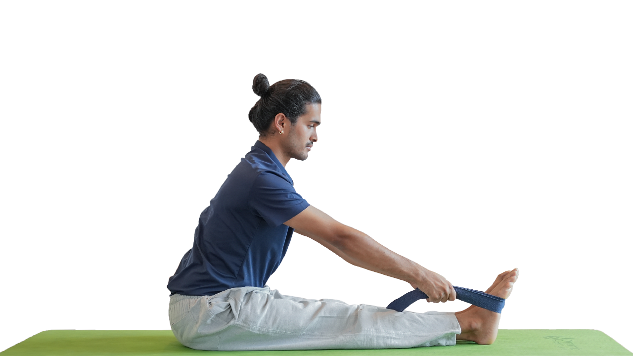 - Use the strap around the feet, slightly lift the head up, keeping the spine straight, open the chest, and stretch further.