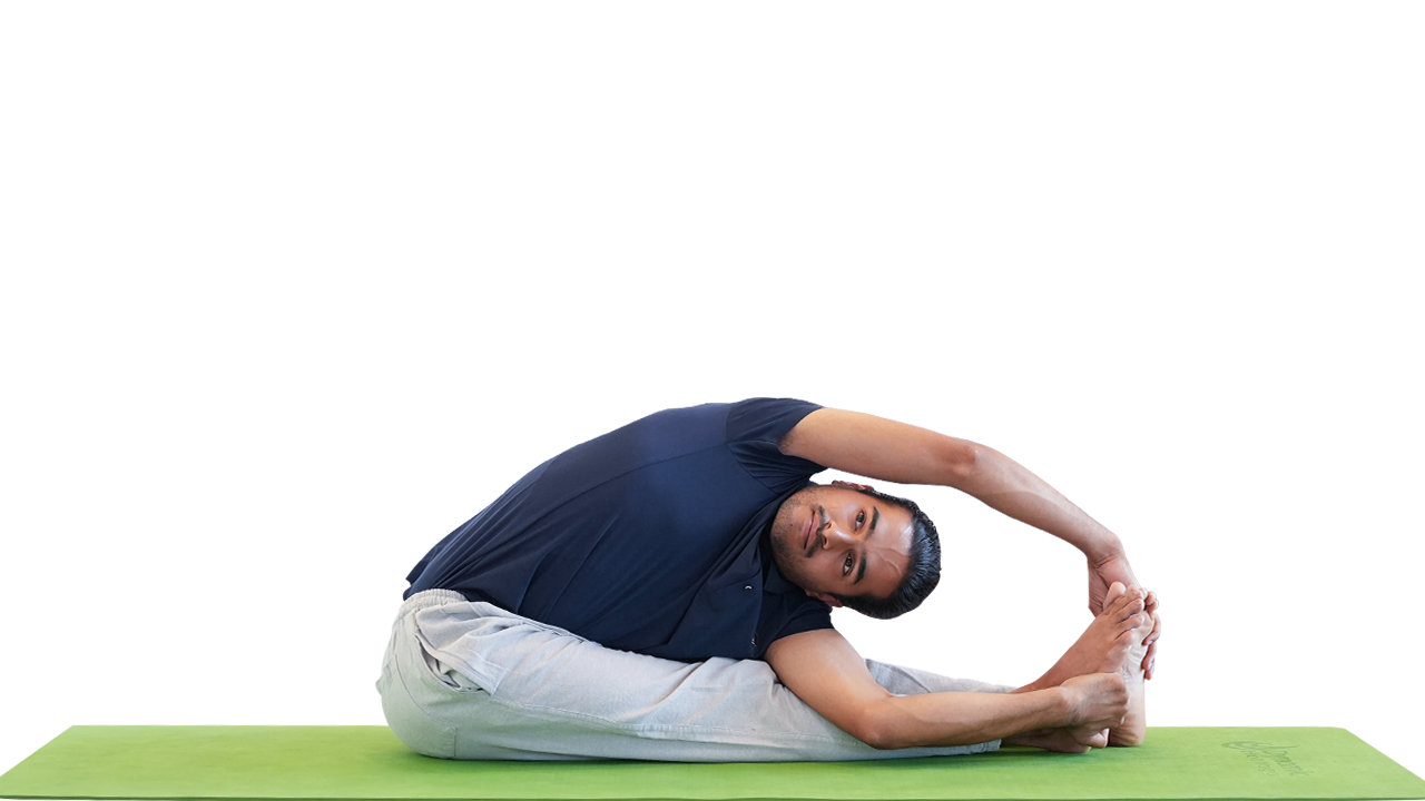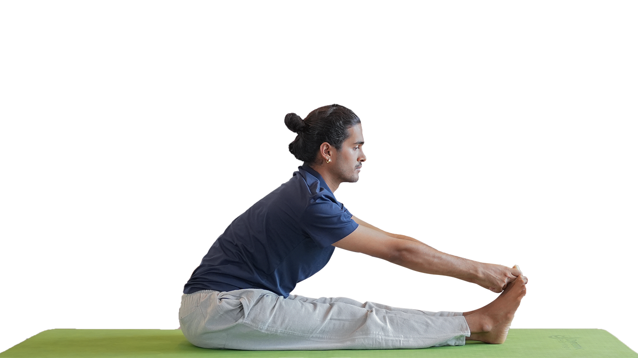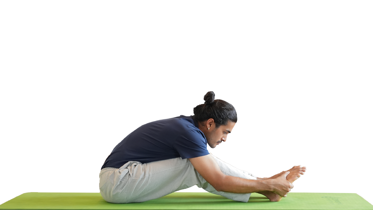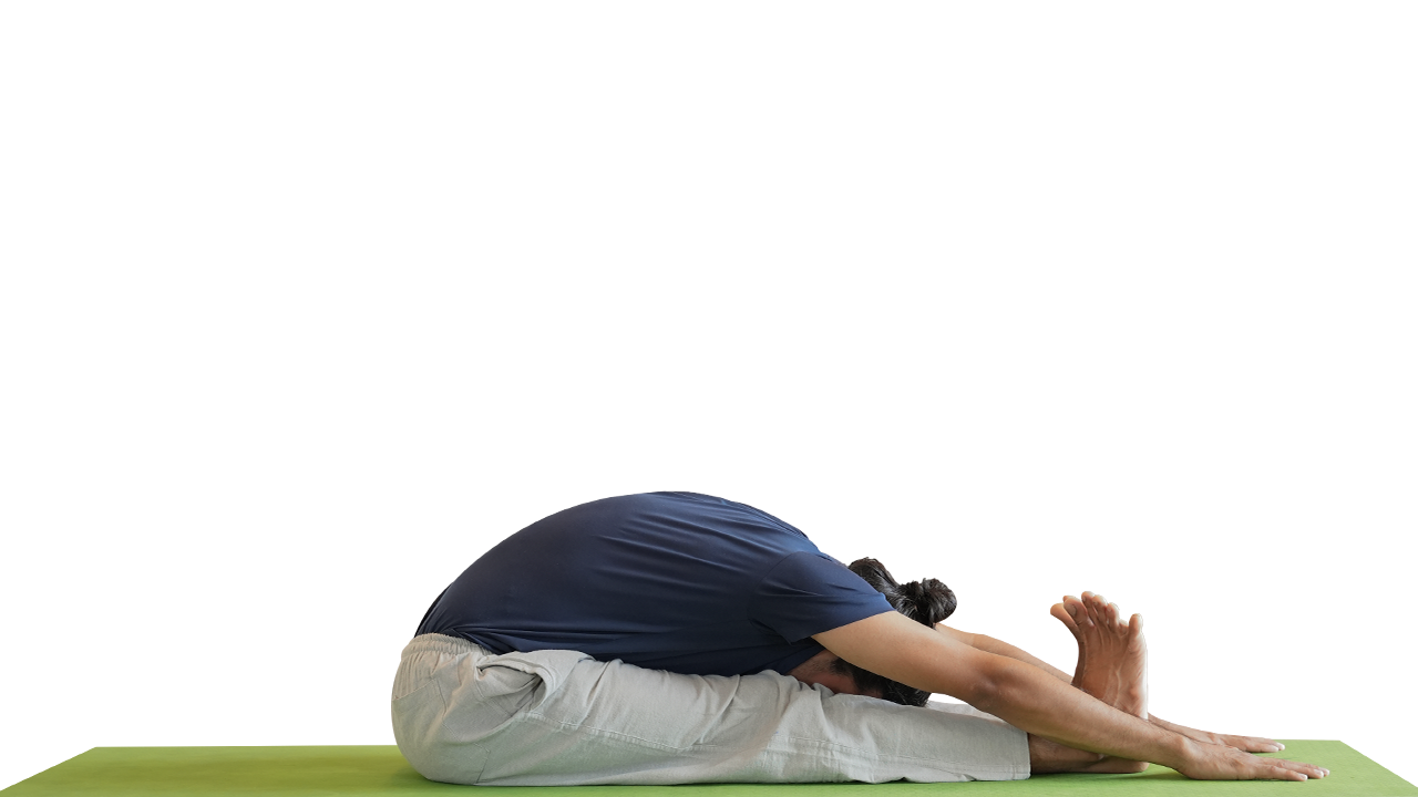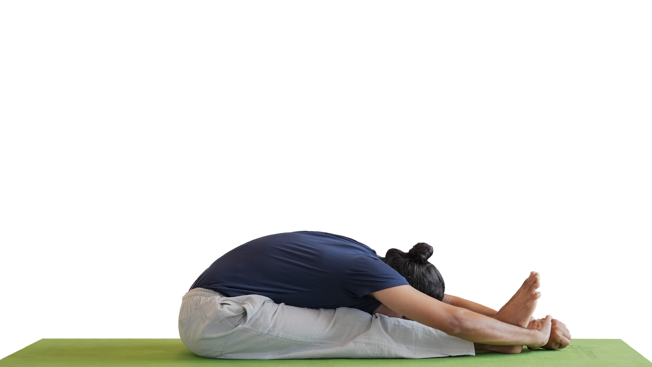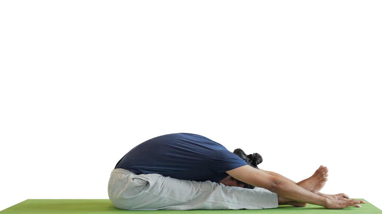 Here’s a step-by-step instructions to getting into Paschimottanāsana (Back Stretching Pose) or seated forward bend pose